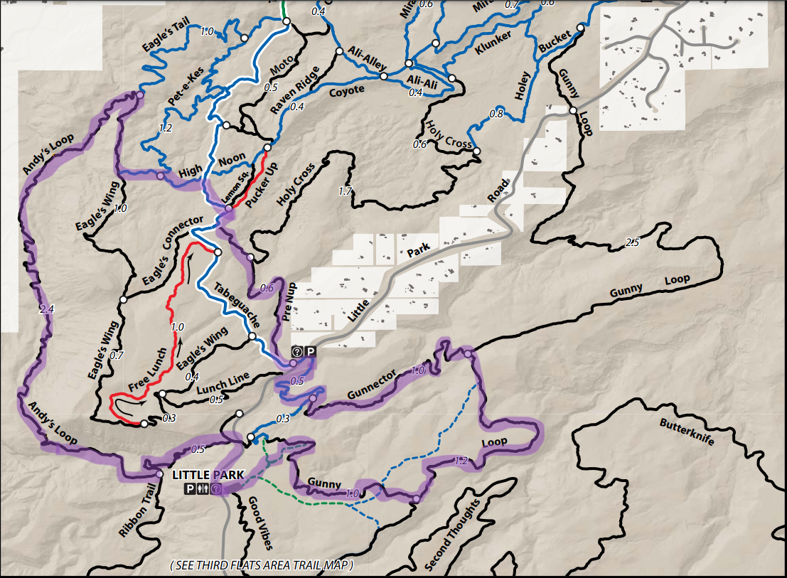 Challenging self-supported single track trail run with considerable downhill in the first half that has to be regained. Down Andys Loop, right up Eagles Wing, left onto High Noon, right up Tabeguache to Holy Cross, bear right up Pre-Nup to Little Park Rd. Cross and descend Little Park Rd 10 yards to Gunny Loop. The courses split at the Gunnector intersection. The short course follows Gunny up to the parking lot finish. The long course follows Gunnector to rejoin Gunny to climb back to the finish.